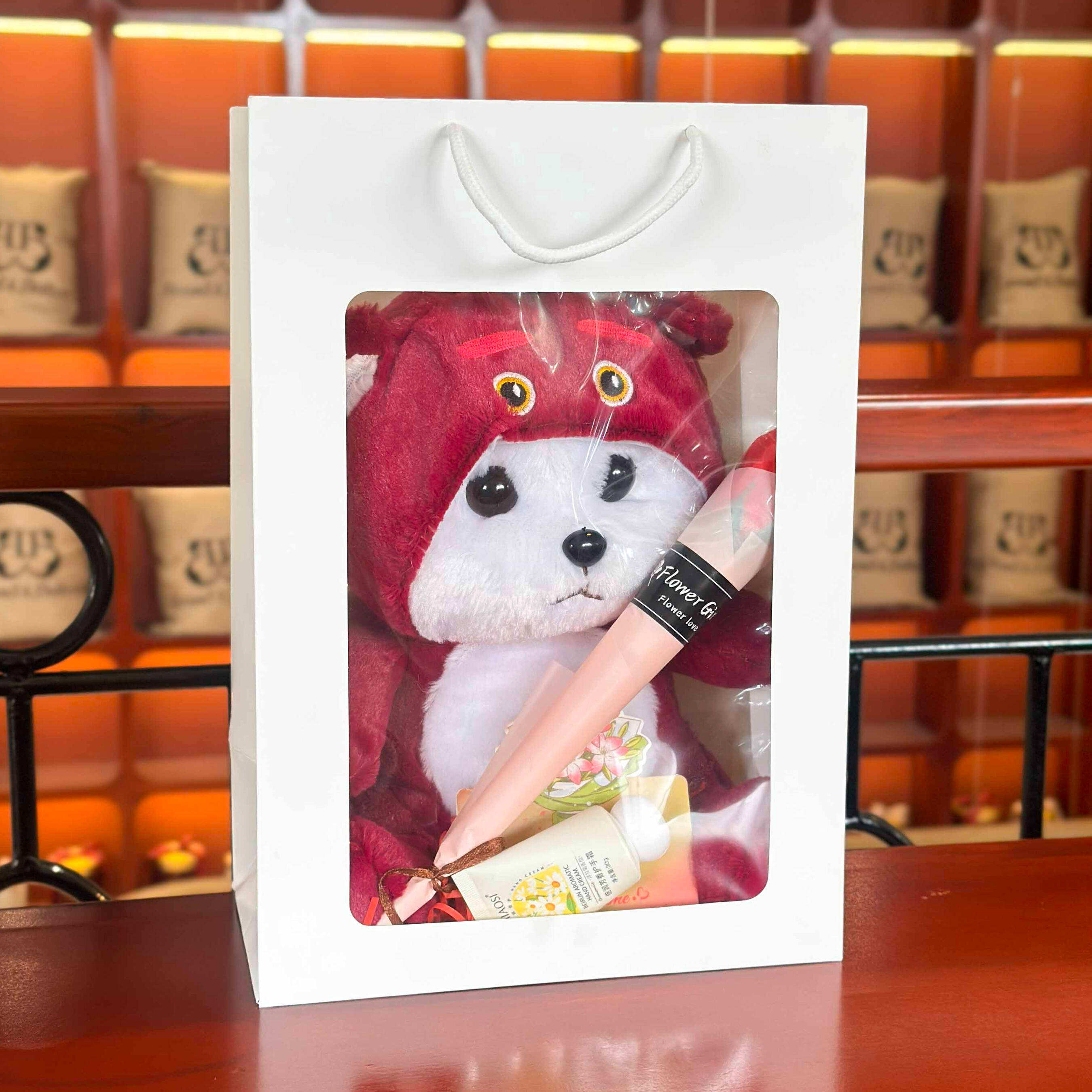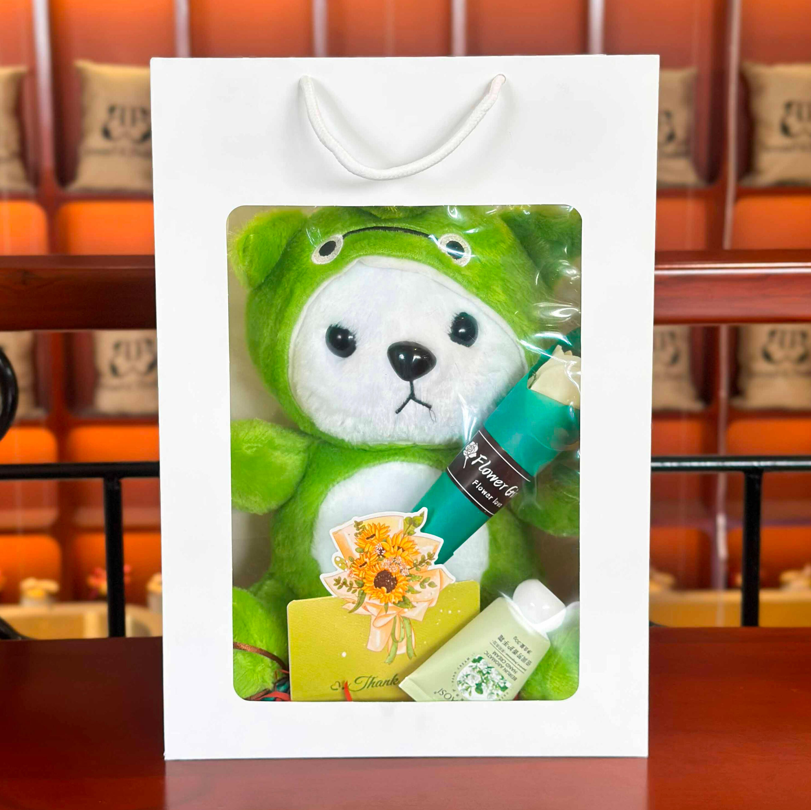 ថែមថង់កាដូរ ផ្កាសាប៊ូ ឡេក្រអូប និងសរសេរកាតជូនពរសម្រាប់អ្នកទទួល