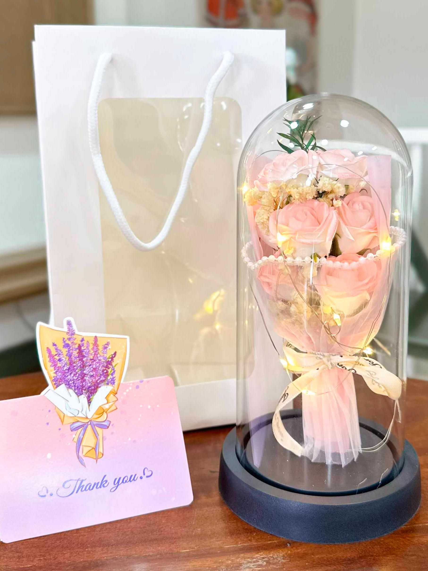 ផ្កាកុលាបមួយទងក្នុងកែវ ជាប្រភេទផ្កាសាប៊ូ មានក្លិនក្រអូប អាចយកស្រទាប់ផ្កាទៅលាងដៃបានទៀត និងមានថែមកាដូរផ្សេងៗ