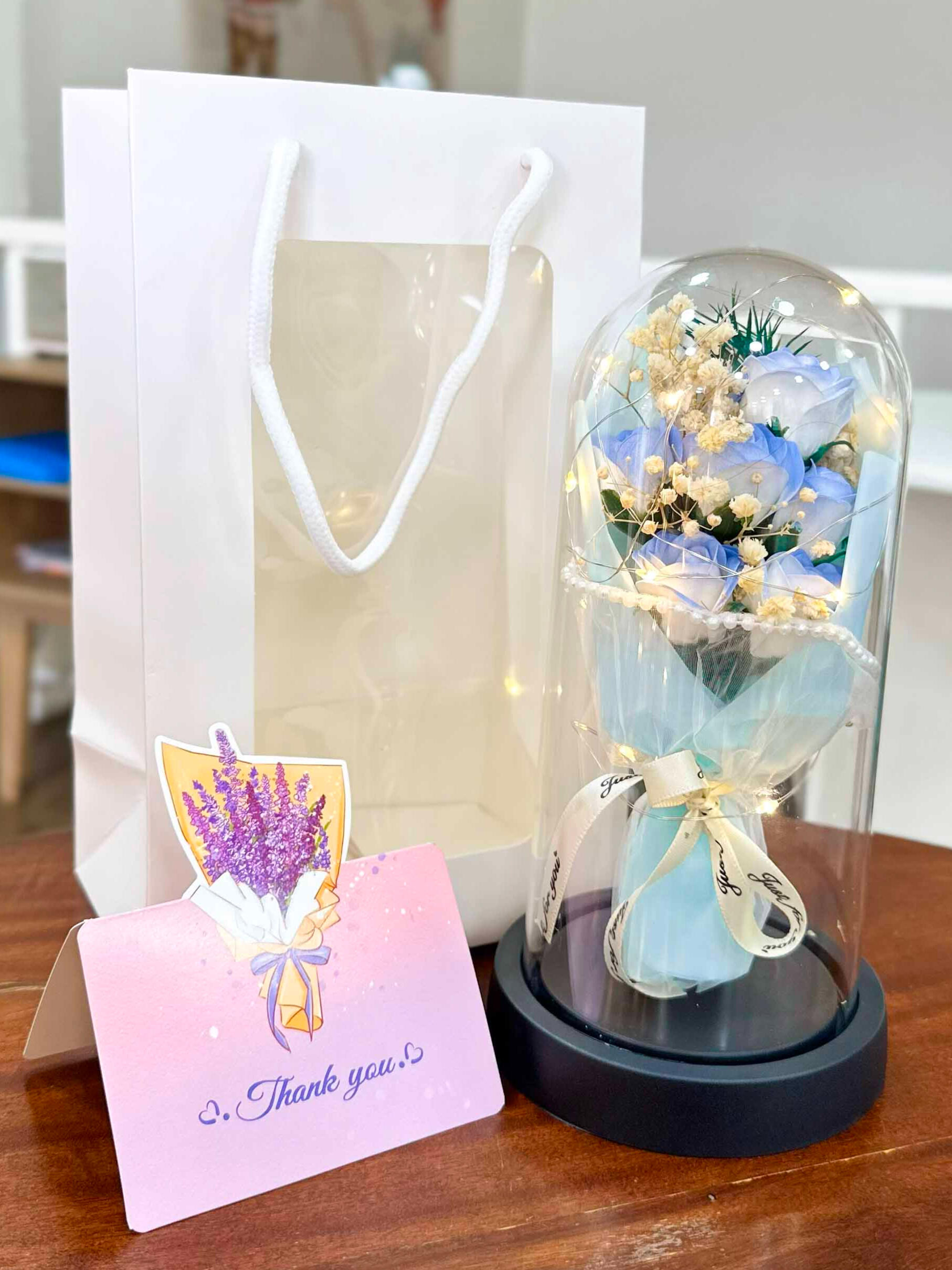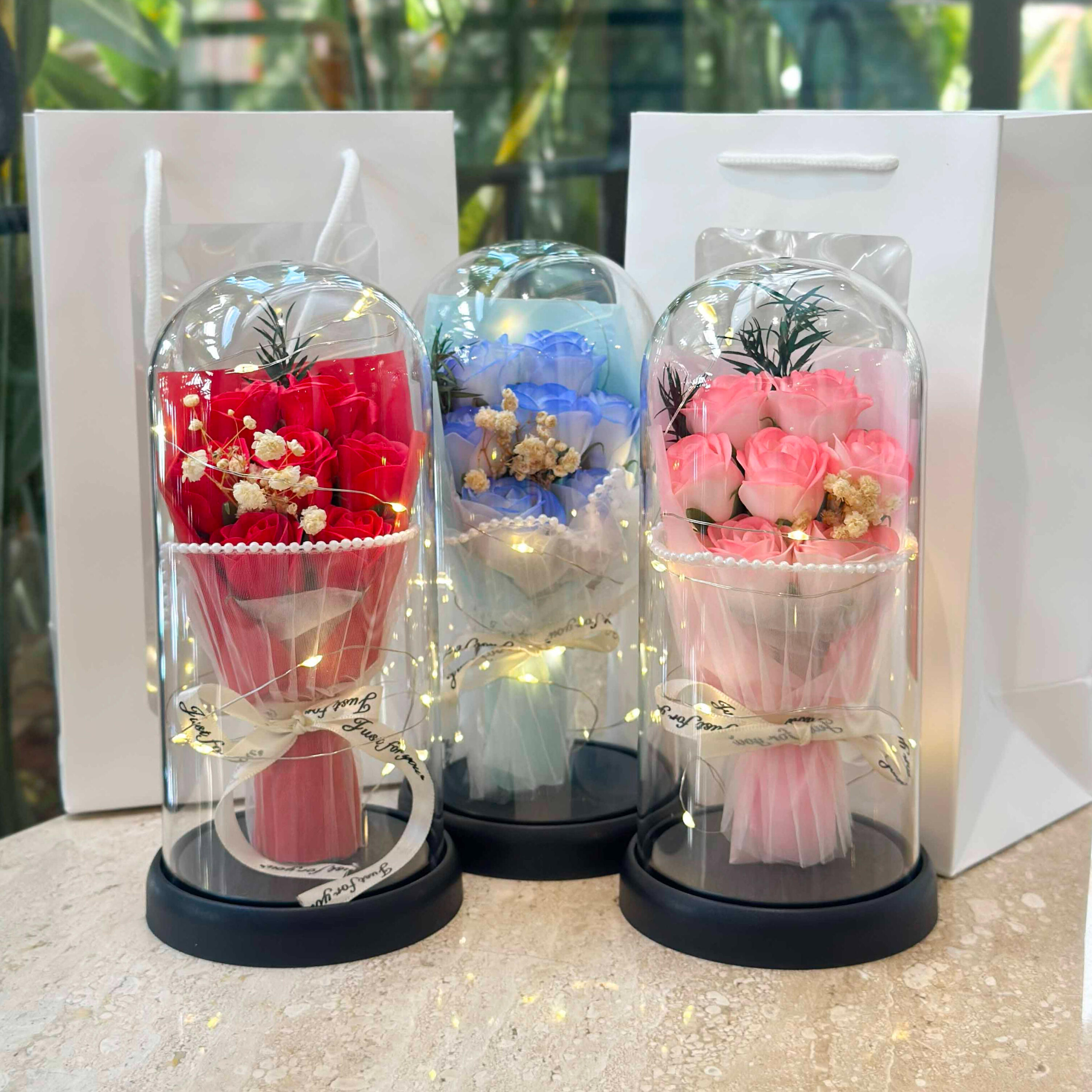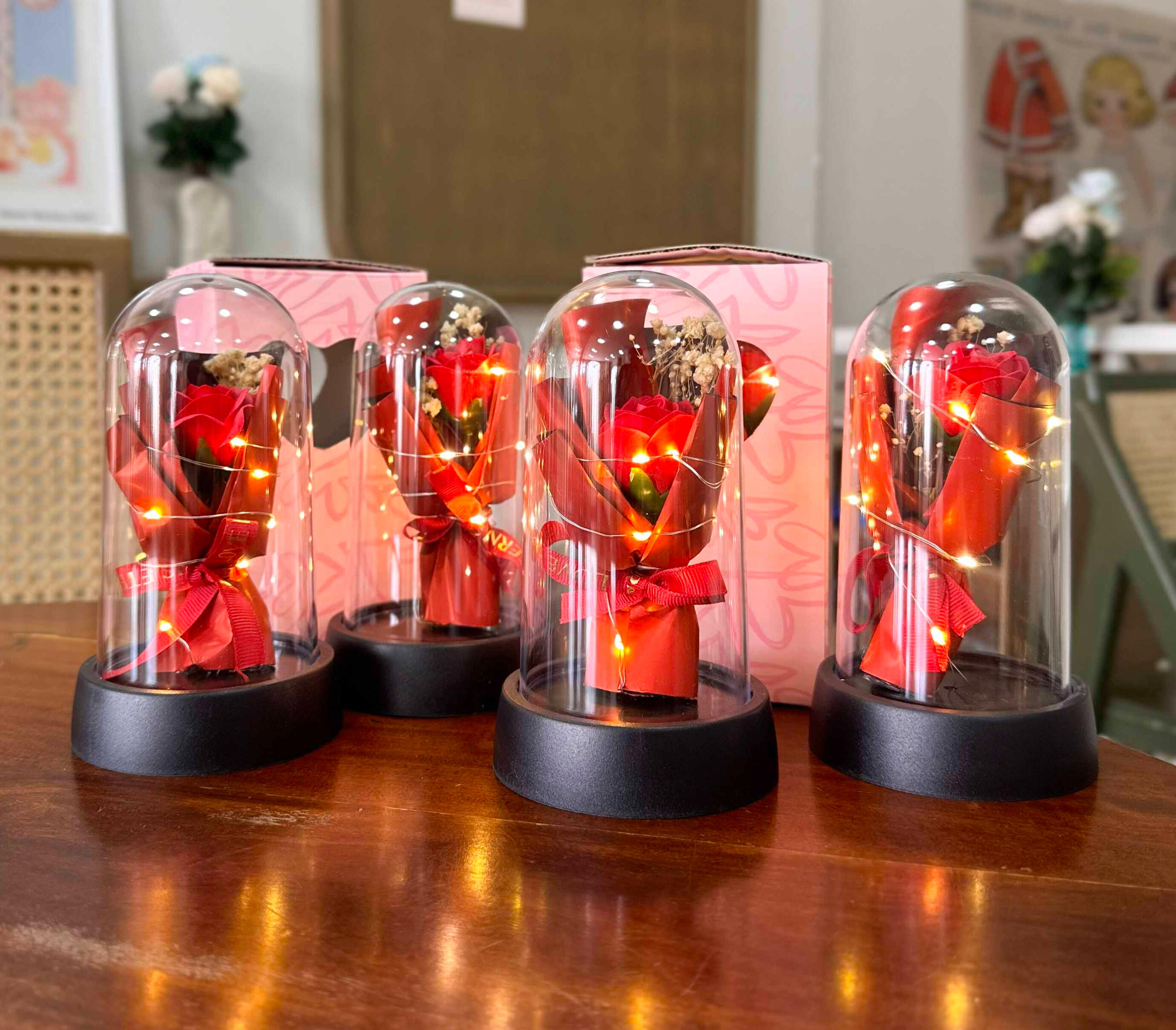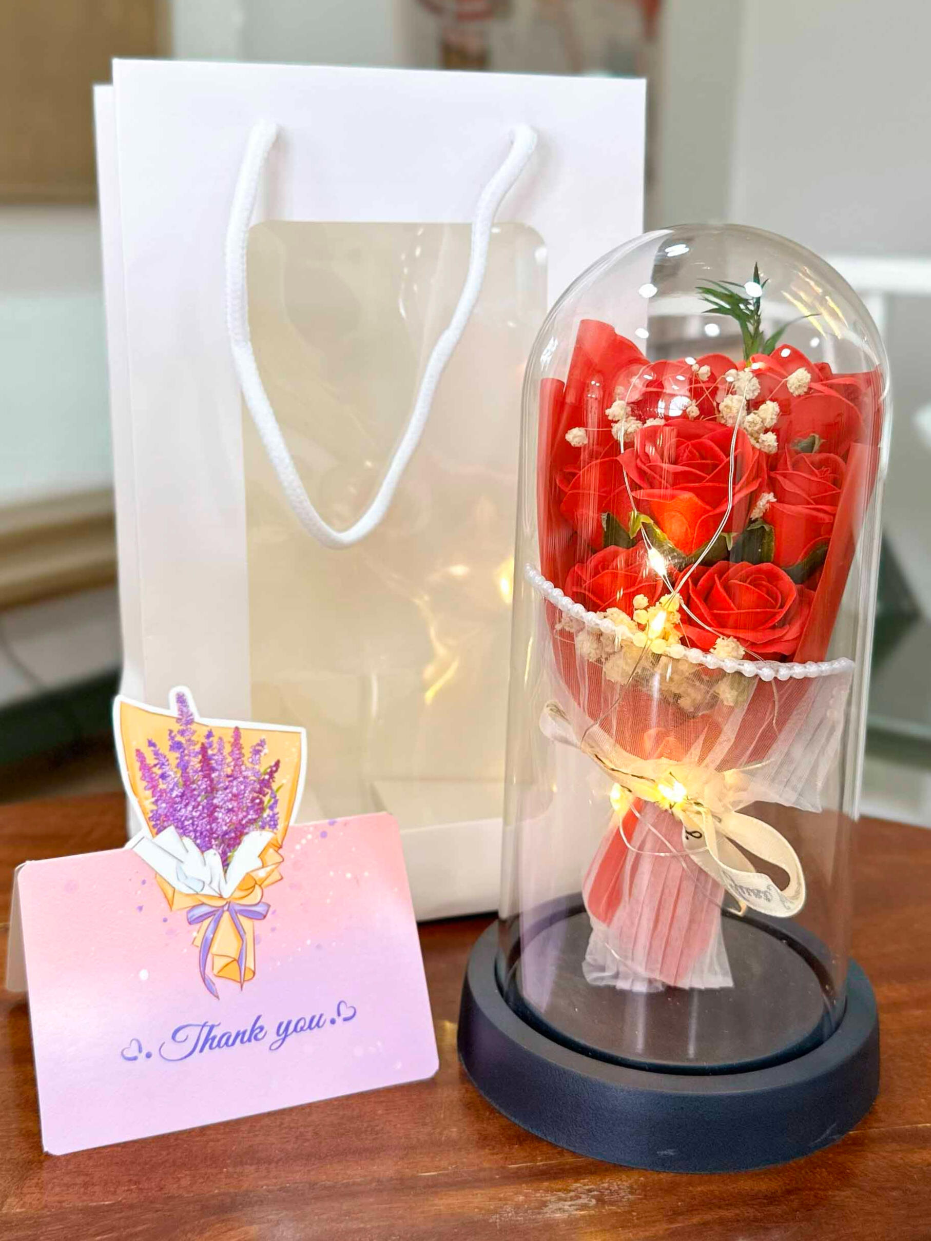 ផ្កាកុលាបមួយទងក្នុងកែវ ជាប្រភេទផ្កាសាប៊ូ មានក្លិនក្រអូប អាចយកស្រទាប់ផ្កាទៅលាងដៃបានទៀត និងមានថែមកាដូរផ្សេងៗ